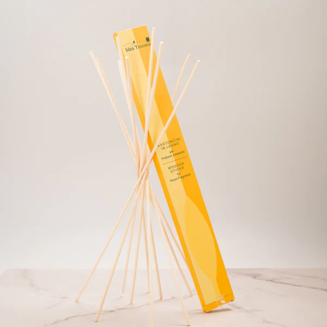 Medinės lazdelės Idea Toscana kambariniams difuzoriams. Lazdelės leidžia kvapui natūraliai, laipsniškai ir efektyviai pasklisti aplinkoje.